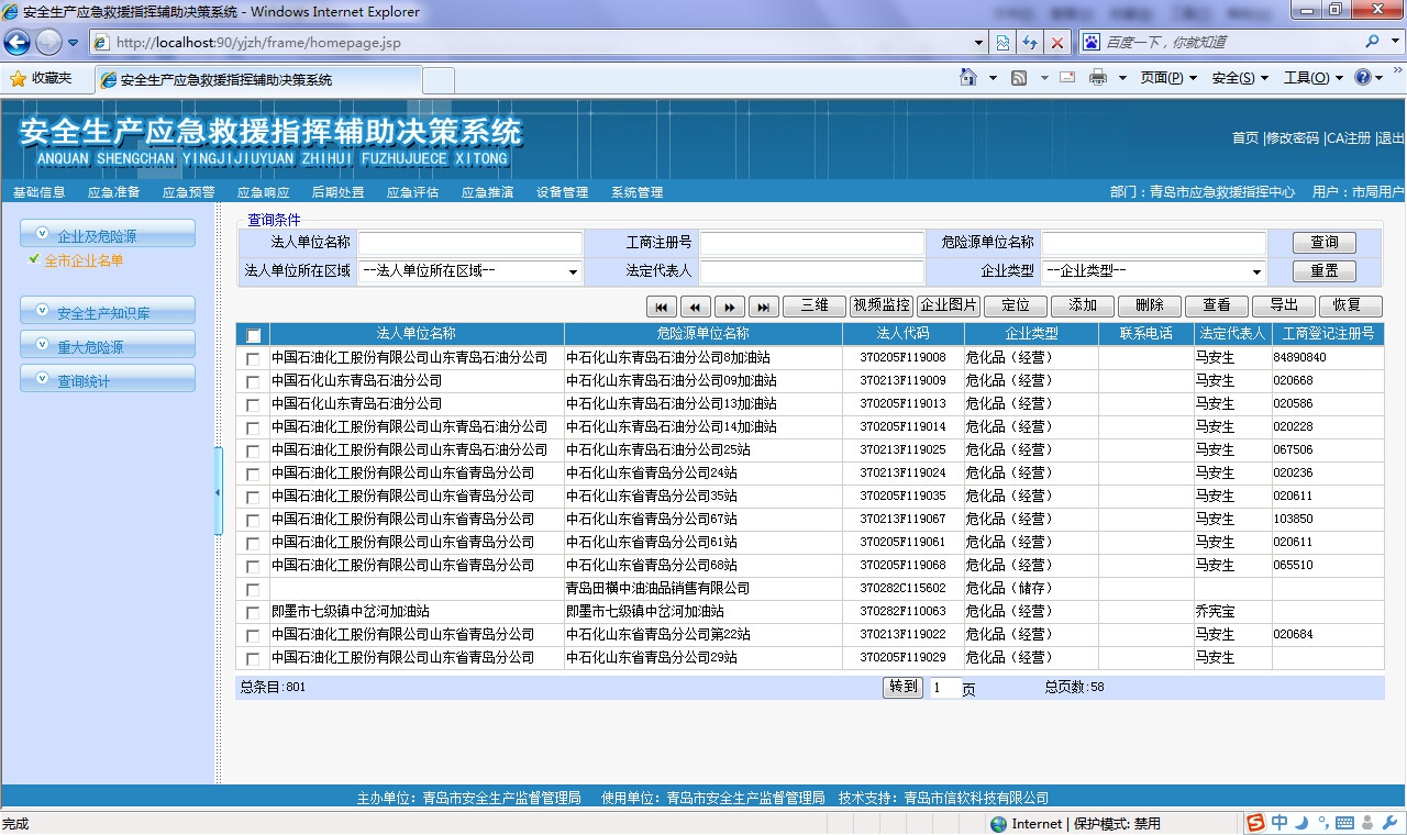 ? 對(duì)存在危險(xiǎn)源的企業(yè)進(jìn)行管理和查詢,可以按地區(qū)、經(jīng)濟(jì)類型、所屬行業(yè)等支持多種查詢條件進(jìn)行綜合查詢,查詢結(jié)果提供企業(yè)和所屬危險(xiǎn)源的具體信息、以樹(shù)形結(jié)構(gòu)展示單位基本情況、及其附屬的安全評(píng)價(jià)、行政許可等分類信息,方便政府主管部門查看危險(xiǎn)源企業(yè)的各種動(dòng)態(tài)情況。可以在線查詢調(diào)閱危險(xiǎn)源視頻監(jiān)控信息、三維模型信息、GIS詳細(xì)信息,企業(yè)及危險(xiǎn)源信息可以導(dǎo)出到excel或者word中。