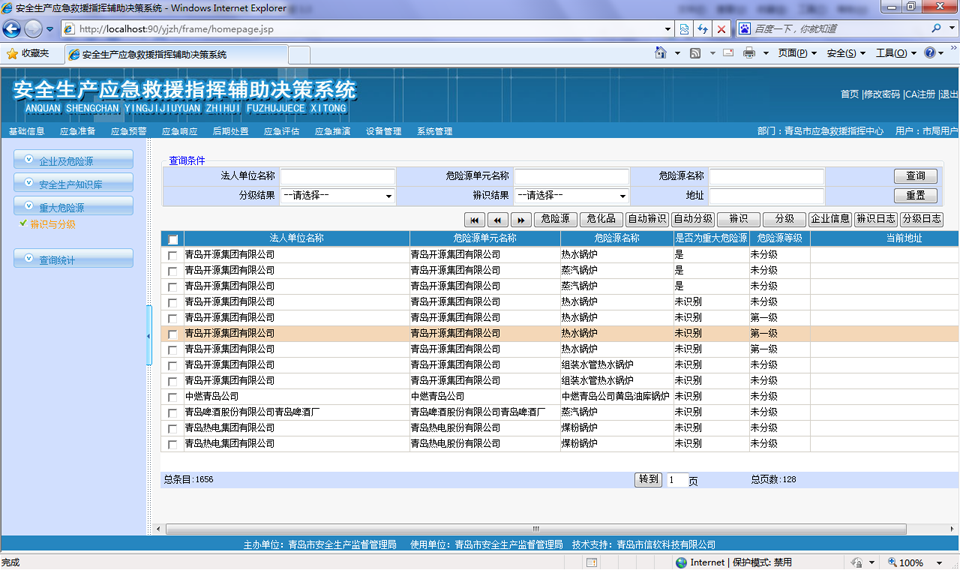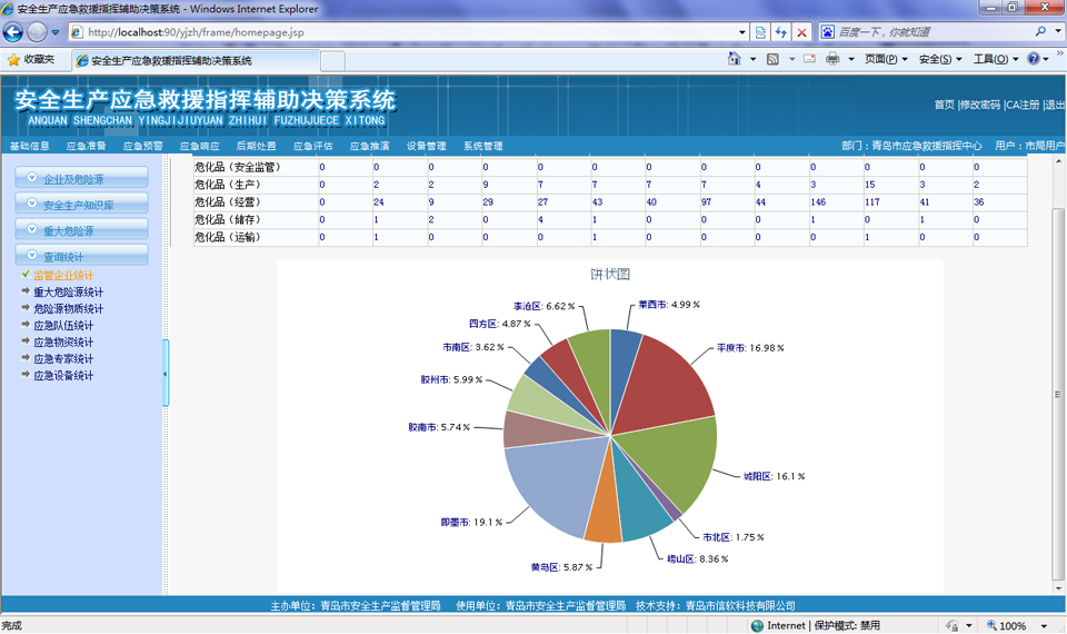 以醒目的報(bào)表形式,對(duì)重大危險(xiǎn)源分布、監(jiān)管企業(yè)、危險(xiǎn)物質(zhì)、應(yīng)急資源進(jìn)行統(tǒng)計(jì)列表展示,并支持多層次頁(yè)面鏈接方式查詢與瀏覽重大危險(xiǎn)源、企業(yè)綜合信息,支持鉆取功能。并在此基礎(chǔ)上進(jìn)行數(shù)據(jù)挖掘和深入分析,查詢結(jié)果既可以顯示為原始的文本數(shù)據(jù)也可以分類統(tǒng)計(jì)總和,提供柱狀、餅狀等各種形式的圖形。