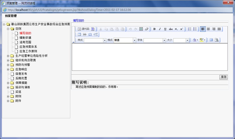 應(yīng)急預(yù)案有綜合應(yīng)急預(yù)案、專項(xiàng)應(yīng)急預(yù)案、現(xiàn)場(chǎng)處置方案構(gòu)成,由于綜合預(yù)案、專項(xiàng)預(yù)案、現(xiàn)場(chǎng)處置預(yù)案的目錄和編制內(nèi)容并不相同,在編制預(yù)案時(shí),編制人員可隨時(shí)讀取預(yù)案模板或案例進(jìn)行參考,系統(tǒng)并可提示幫助信息,輔助完成預(yù)案的編制、修訂。