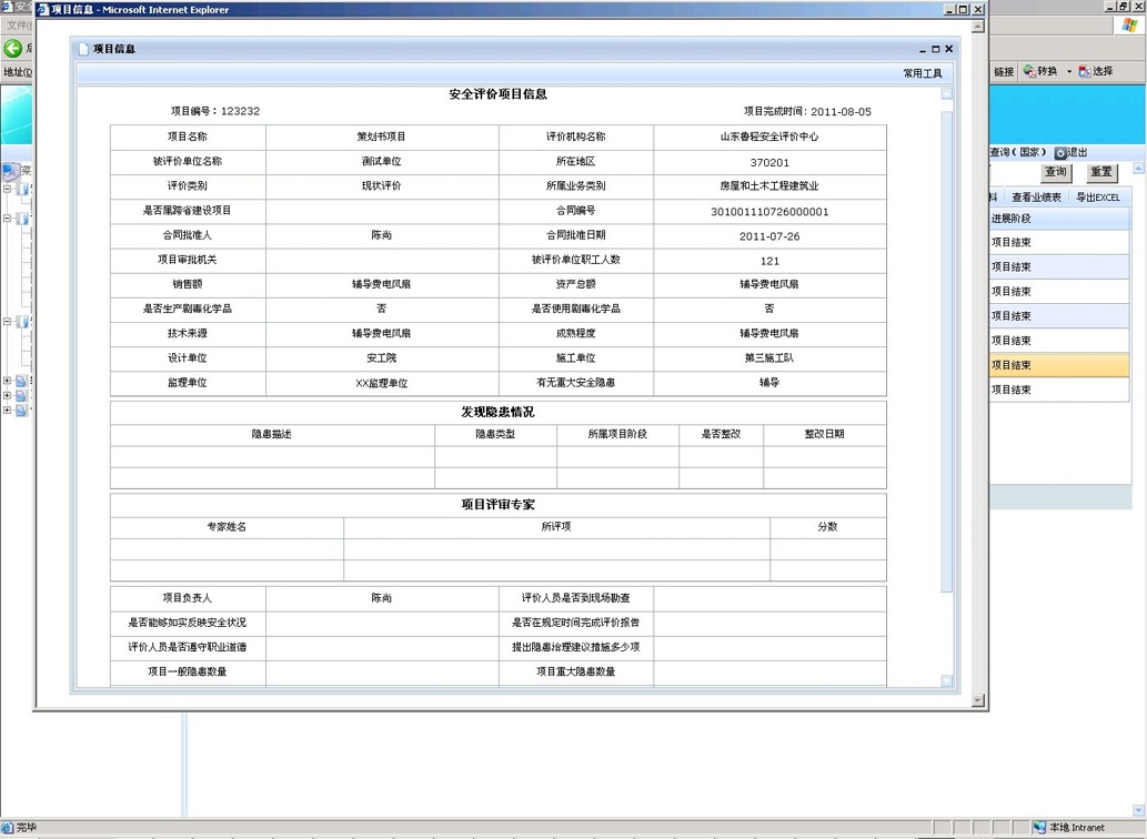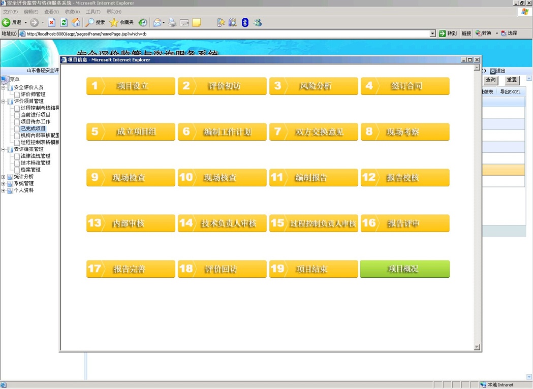 按照安評(píng)過(guò)程控制標(biāo)準(zhǔn),結(jié)合安全評(píng)價(jià)機(jī)構(gòu)的日常工作流程,對(duì)安全評(píng)價(jià)整個(gè)過(guò)程進(jìn)行網(wǎng)絡(luò)化地控制和監(jiān)管,根據(jù)風(fēng)險(xiǎn)分析、實(shí)施評(píng)價(jià)、報(bào)告審核、技術(shù)支撐、作業(yè)文件、內(nèi)部管理、檔案管理和檢查改進(jìn)八要素對(duì)所有評(píng)價(jià)項(xiàng)目過(guò)程進(jìn)行嚴(yán)格把關(guān),要求安全評(píng)價(jià)機(jī)構(gòu)將現(xiàn)有項(xiàng)目的進(jìn)度情況及時(shí)上報(bào)到系統(tǒng)中,規(guī)范安全評(píng)價(jià)機(jī)構(gòu)工作流程,實(shí)現(xiàn)安全評(píng)價(jià)過(guò)程控制的信息化,在方便安全評(píng)價(jià)機(jī)構(gòu)內(nèi)部管理的同時(shí)有利于監(jiān)管部門對(duì)安全評(píng)價(jià)機(jī)構(gòu)的評(píng)價(jià)行為進(jìn)行實(shí)時(shí)動(dòng)態(tài)的監(jiān)督管理。