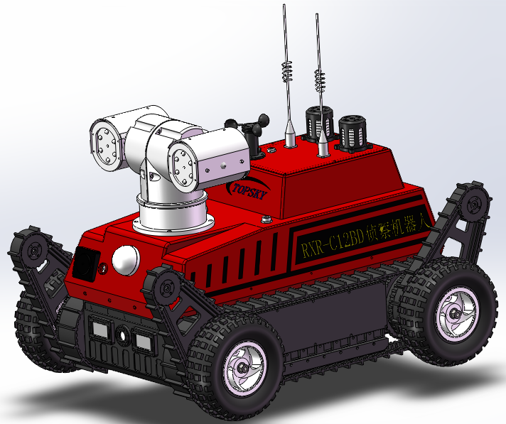 1) 車體★結(jié)構(gòu)型式:采用前后4擺臂+履帶+金屬輪胎的結(jié)構(gòu)形式,最大有效提高前進(jìn)速度、越障性能,同時(shí)金屬輪胎可以抗高溫,適合在火區(qū)高溫滅火救援。
