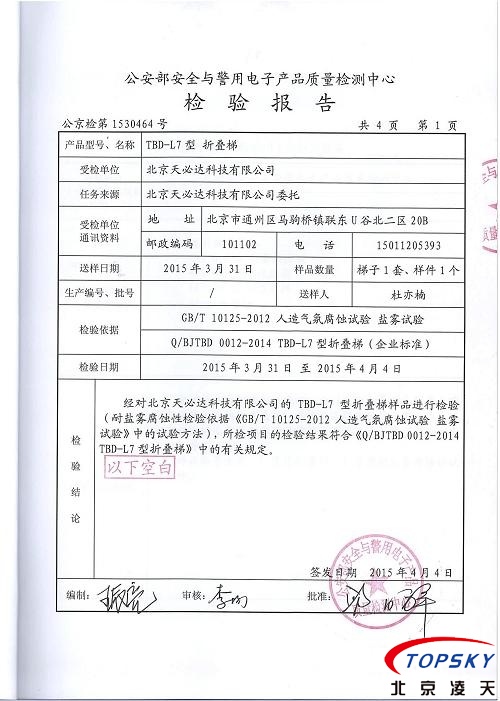 此款折疊梯是由鋁合金材料制成的,連接銷為不銹鋼,操作極為簡(jiǎn)便且使用安全可靠。相比于傳統(tǒng)的梯子,它的主要特點(diǎn)是重量輕,折疊后體積小,可以放在一個(gè)小箱子內(nèi),攜帶方便,適用于處理各種緊急情況;例如人質(zhì)救援,包圍犯罪分子,也可以用于水上救援時(shí)做跳板用。 本產(chǎn)品通過公安部安全與電子產(chǎn)品檢測(cè)檢驗(yàn)中心檢測(cè),檢測(cè)報(bào)告編號(hào):公京檢第1530464號(hào)。