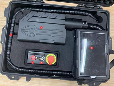 激光破拆工具組+智能遠(yuǎn)距離激光切割系統(tǒng)+未爆彈激光銷毀器,破拆工具的六脈神劍。裝置主要由激光發(fā)射器機(jī)箱、激光發(fā)射器(含觀瞄模塊)三腳架轉(zhuǎn) 臺(tái)、外置電池、連接線、手持控制終端、電池充電器等配件組成。