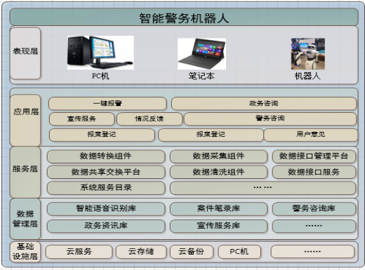 警務服務機器人總體涵蓋一鍵報警、生活咨詢、情況反饋、警務咨詢、政務資訊、宣傳服務、報案登記、用戶意見八個功能模塊,人機語音交互。同時解決“警力有限,民力無窮”,“人工智能+警務”的深化運用,智能警務機器人應運而生,不僅提高警務科技含量,也極大緩解警員警力不足、警務工作效率低、人民群眾辦事難的問題。