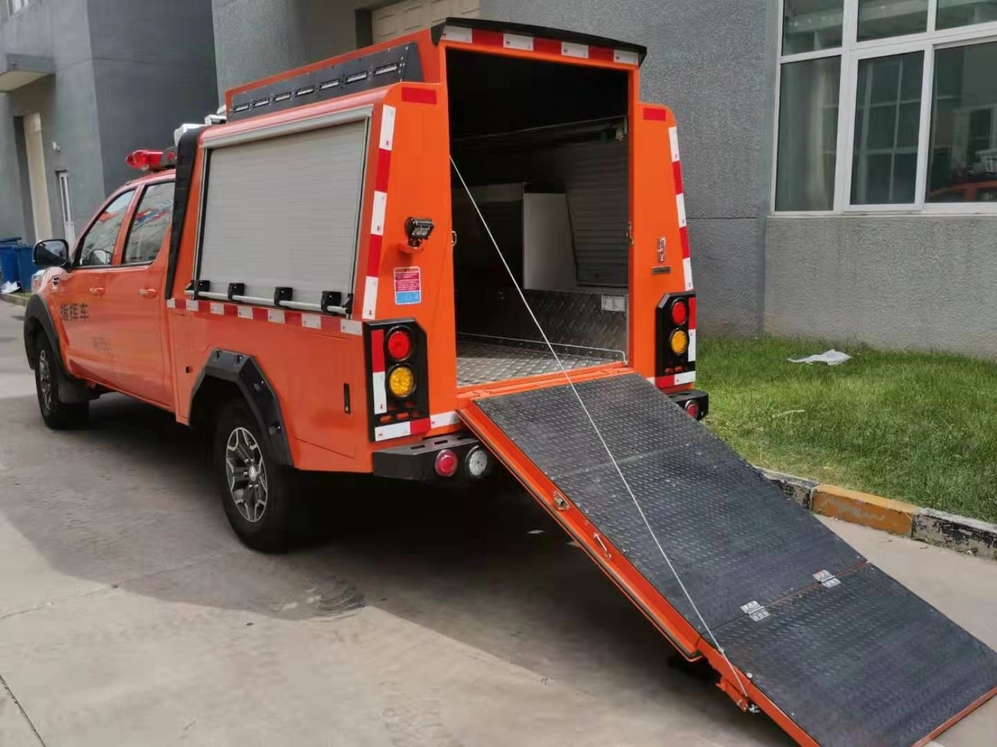 專(zhuān)門(mén)為特種機(jī)器人量身定做的一款機(jī)器人運(yùn)輸車(chē),由皮卡車(chē)改裝,區(qū)別于傳統(tǒng)意義上大型運(yùn)輸車(chē),體積更小,動(dòng)力更足。車(chē)廂設(shè)計(jì)有升降照明系統(tǒng),解決了救援現(xiàn)場(chǎng)能見(jiàn)度低的問(wèn)題,1.2-1.8米升降高度,可滿(mǎn)足不同照明需求。車(chē)體頂部裝有4G圖像傳輸系統(tǒng),可將現(xiàn)場(chǎng)情況實(shí)時(shí)傳輸?shù)街笓]部,有利于指揮現(xiàn)場(chǎng)調(diào)度。配有一體化機(jī)器人裝運(yùn)梯,最大承壓≥600Kg。后箱四周配有一圈小型照明系統(tǒng),可用于晚間或光線昏暗等環(huán)境。后箱設(shè)計(jì)有獨(dú)立儲(chǔ)物架,可放置機(jī)器人配套設(shè)備。兩側(cè)卷閘窗設(shè)計(jì)方便拿用。