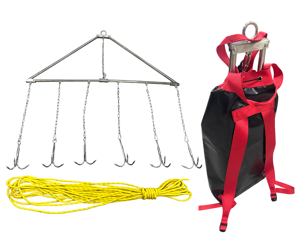 滾鉤整體為不銹鋼材質(zhì),鉤體采用三爪錨鉤,用于水下搜索溺水人員。整體三角可拆卸式,三角架經(jīng)過靜載荷性能測試:承重220KG。材質(zhì):304不銹鋼材質(zhì);一套滾鉤24 枚, 鉤體:為三爪倒鉤形式,鉤體粗3mm、長度100mm,鉤與鉤間距15cm;主繩:長1500mm,直徑12mm。