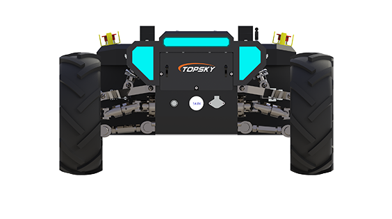 差速輪式機器人底盤采用鋰電池電源作為機器人動力源,使用無線遙控的方式遠距離操控機器人,并可定制復雜的操作模式,主控提供串口/標準CAN總線作為通訊接口。整機采用四輪獨立驅(qū)動、四輪差速轉(zhuǎn)向以及前后雙橫臂獨立懸架結(jié)構(gòu),具有IP65防塵防水能力,能夠在多種復雜環(huán)境運行。同時,整機采用模塊化設計,四獨立懸掛、左右電控箱及電池可快速拆卸維護更換??纱钶d多種設備從而代替人進行高效率作業(yè)。