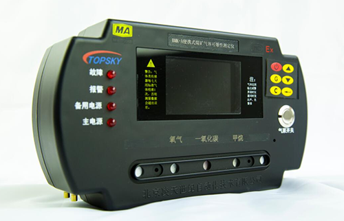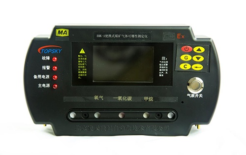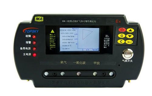 BMK-A便攜式煤礦氣體可爆性測定儀(以下簡稱測爆儀),是用于煤礦井下使用的礦用本安兼隔爆型攜帶式儀器。測爆儀用于煤礦井下,由礦山救護隊員攜帶進入災(zāi)區(qū),監(jiān)視作業(yè)環(huán)境周圍氣體組份是否存在爆炸危險。也可由消火人員攜帶,在處理自然發(fā)火或啟封火區(qū)過程中,檢測周圍環(huán)境或密閉內(nèi)空氣中甲烷、氧的濃度值,在儀器液晶顯示屏上直接顯示出O2、CH4、CO的濃度值和環(huán)境溫度值,并顯示出“爆炸三角形”的圖形及各氣體組份所構(gòu)成的坐標點,臨近或達到警界限時儀器同時發(fā)出聲、光警報。