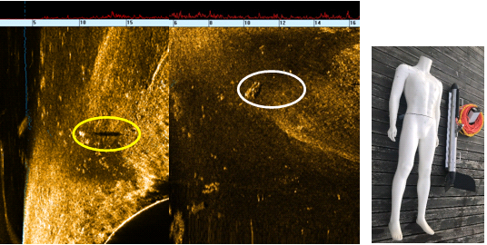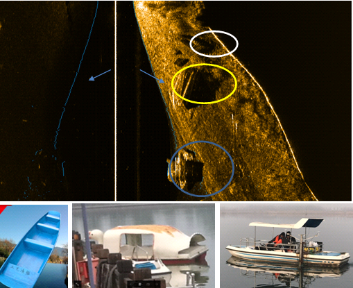 其中,藍(lán)色箭頭指向藍(lán)色線條為自動(dòng)檢測的水底線,三艘沉船,分別對(duì)應(yīng)實(shí)物如下,小船約為3米長,大船約為5米長。