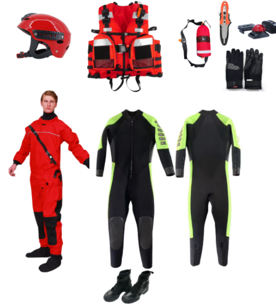由水域救援頭盔、水域救援手套、水域救援靴、激流救生衣、特級(jí)干式/濕式救援服,大音量救生口哨、水域救生刀、多用途信號(hào)燈、拋繩包等組成。